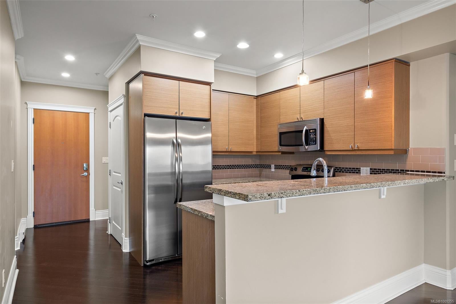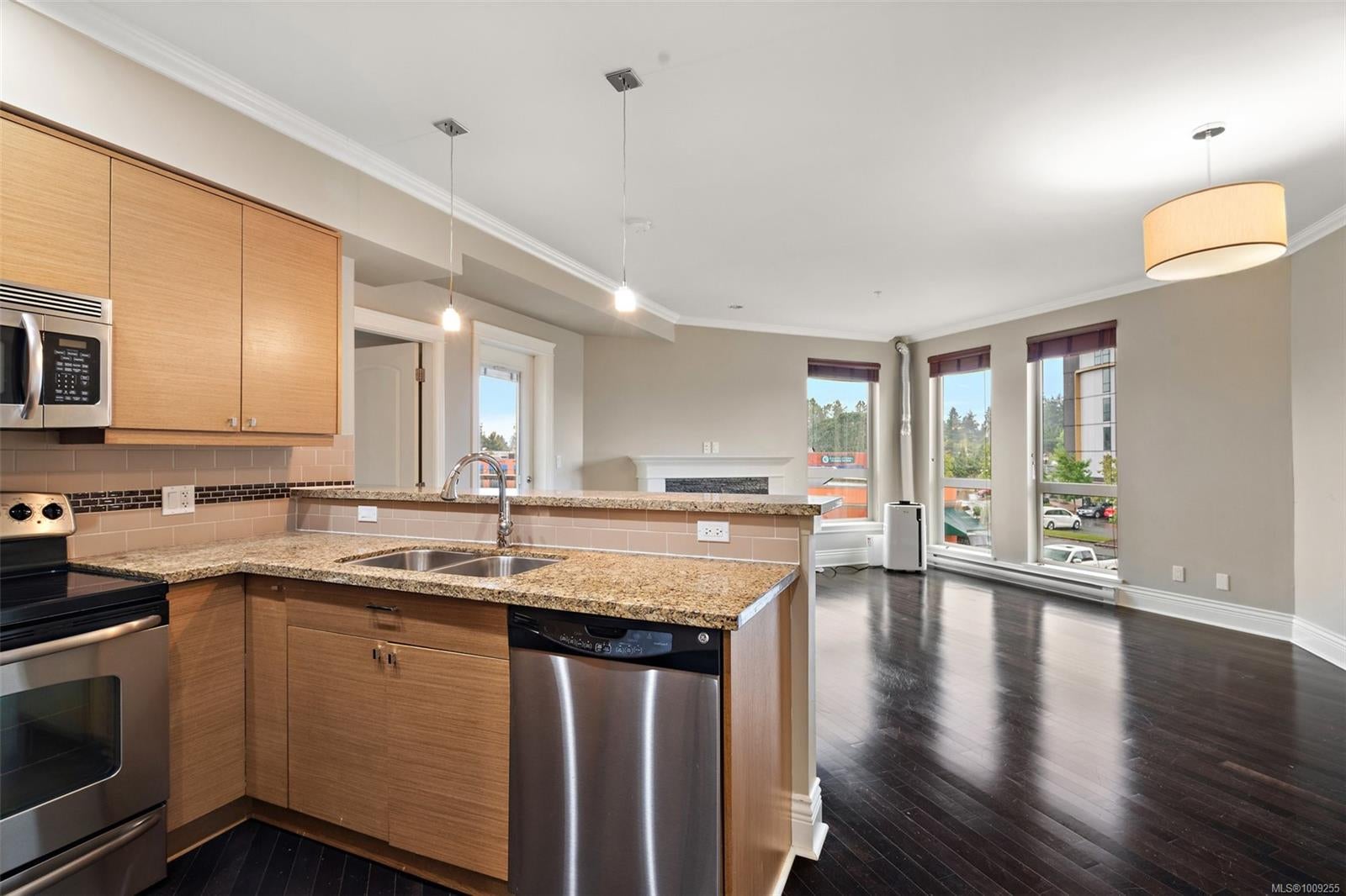 Discover this stunning 2-bedroom, 2-bath unit located in the heart of Langford. Comes with a underground parking stall and a storage unit, this home combines value, comfort, and convenience. Step inside and enjoy the 8 foot 9 inch-foot ceilings, oversized windows that flood the space with natural light, beautiful hardwood floors and carpeted bedrooms. The kitchen features granite countertops, a stylish eating bar, and flows seamlessly into the open dining and living areas—perfect for entertaining or simply relaxing at home. Unwind on your private balcony during warm summer evenings, or retreat to the spacious primary bedroom that fits a king-size bed. A custom walk-in closet and ensuite with a tub make this suite a true retreat. Steps to all amenities, shopping, parks and the new University